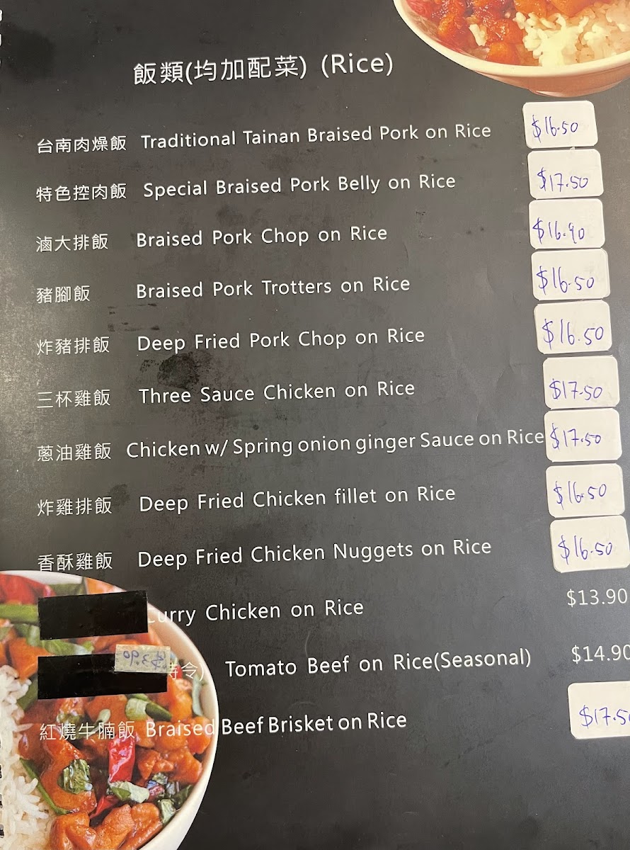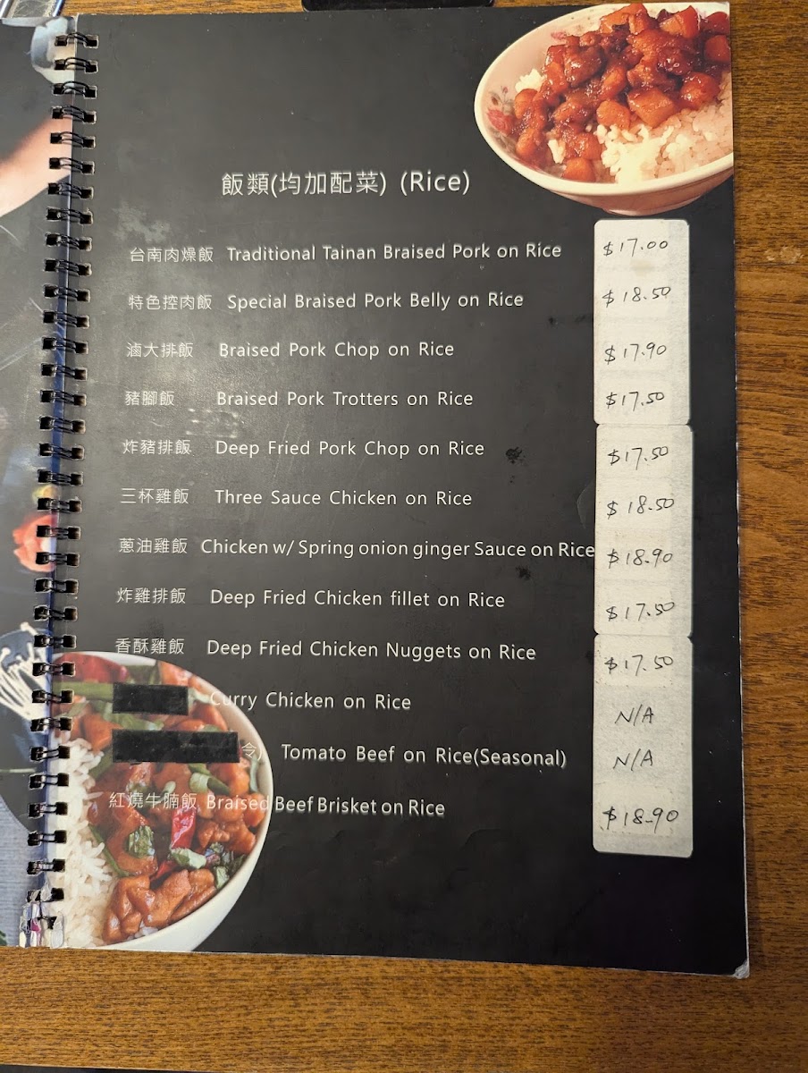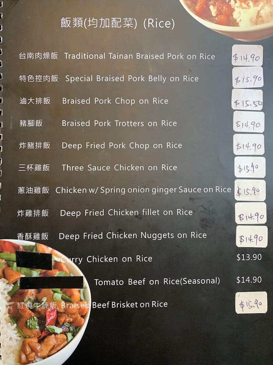 The rice section stands out as a core highlight, showcasing hearty, satisfying meals such as Traditional Tainan Braised Pork On Rice, Deep Fried Popcorn Chicken On Rice, Deep Fried Pork Chop On Rice, Braised Pork Chop On Rice, and Chicken With Spring Onion Ginger Sauce On Rice. Each dish reflects the Taiwanese philosophy of simple ingredients elevated through careful seasoning and slow-cooked flavors.