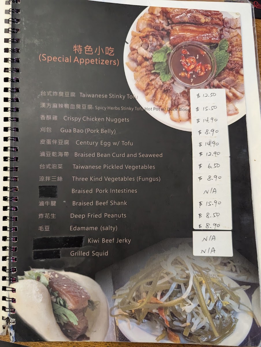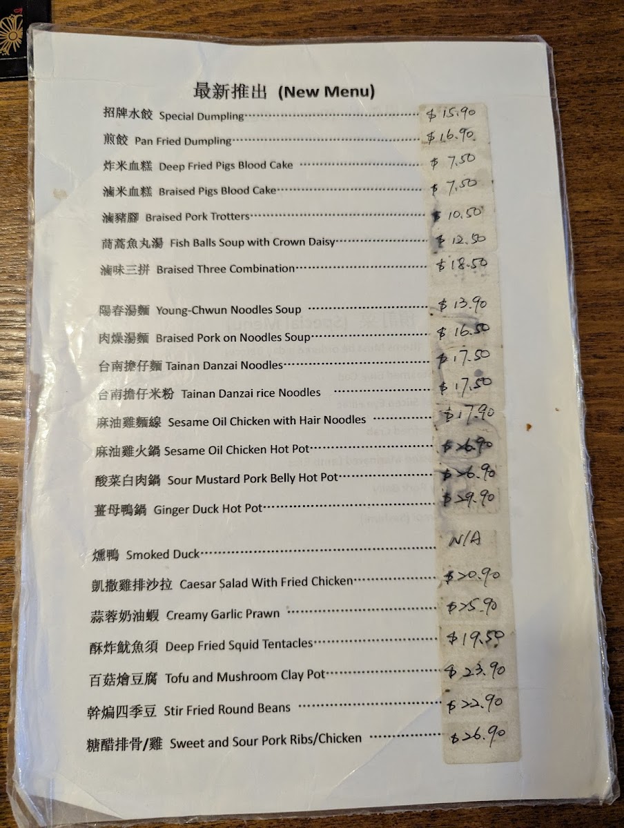 The menu also caters to adventurous palates with Hot Pot options like Spicy Herb Stinky Tofu Hot Pot With Raw Duck Blood and Stewed Beef Brisket Raw Hot Pot, both deeply rooted in Taiwanese culinary tradition. Finally, noodle lovers are well served with choices such as Tainan Danzai Rice Noodles, Tainan Danzai Noodles, Soya Bean Paste With Mince Noodles, Braised Pork On Noodles Soup, and Traditional Braised Pork On Noodles, rounding out a menu that feels complete, authentic, and satisfying from start to finish.